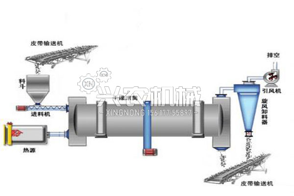 该烘干机主要由供热源、上料机、进料机、回转滚筒、出料机、引风机、卸料器和配电柜构成;脱水后的湿物料从干燥机一端投入后,在内筒均布的抄板器翻动下,物料在干燥器内均匀分布与分散,并与并流(逆流)的热空气充分接触,加快了干燥传热,传质推动力。在干燥过程中,物料在带有倾斜度的抄板和热气流的作用下,可调控地运动至干燥机另一段星形卸料阀排出成品。